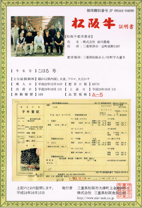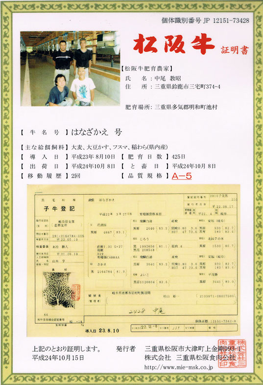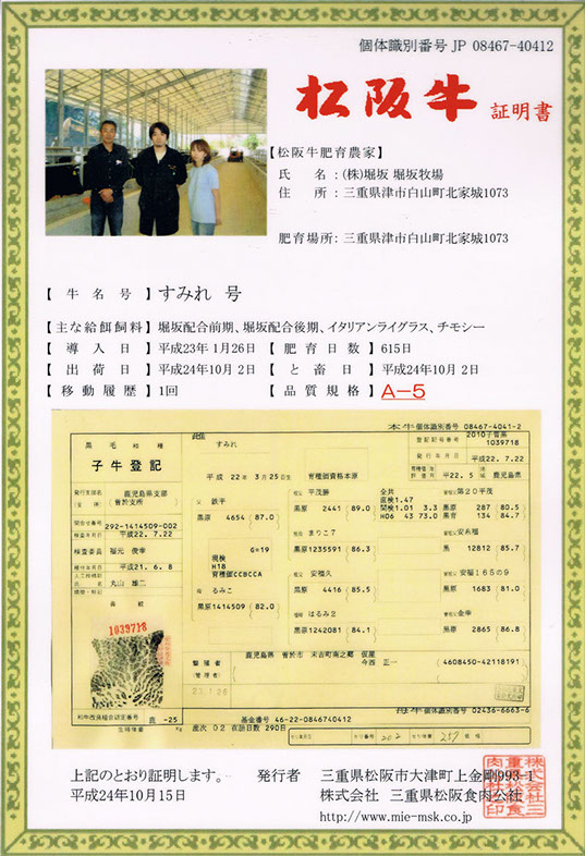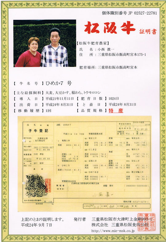 店頭においては、松阪牛証明書並びに松阪牛シールで「松阪牛」と表示されています。店頭で販売されている肉のパックにシールが添付され、真っ赤な肉太の独特の書体で「松阪牛」と書かれています。これが松阪牛シールで、10桁の個体識別番号、牛の肥育場所、肥育した農家の名前のほか、特産・A5・A4などの品質規格が記載されています。 この証明書・シールに記載された10桁の個体識別番号によりインターネット又は携帯電話で検索し、システムに登録された情報をご確認いただけます。主な内容は、牛の生年月日、出生地、肥育場所、牛の写真、血統、肥育した農家の住所氏名、肥育日数などです。 このような徹底した管理により、松阪牛の安全・安心を提供しています。